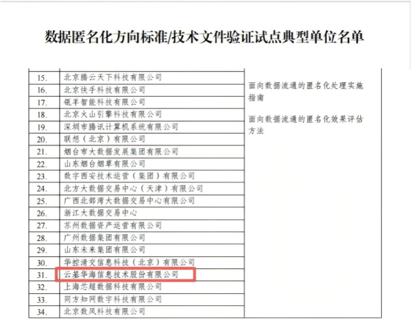 为持续提高标准技术指标的先进性、科学性和适用性,在国家数据局指导下,全国数据标准化技术委员会(以下简称“全国数标委”)秘书处组织开展了数据基础设施、高质量数据集、数据匿名化等6个重点方向15个标准和2个技术文件的验证试点工作,经形式审查、标准验证、报告评审等过程,形成数据领域重点标准验证试点典型单位。云基华海信息技术股份有限公司(简称“云基华海”)凭借在数据要素领域的深厚技术积累与实践成果,成功入选数据基础设施方向、高质量数据集及数据匿名化方向标准/技术文件验证试点典型单位。