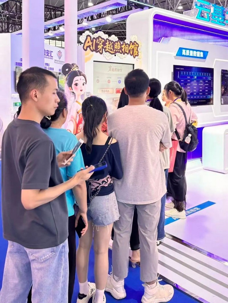互动区域,云基华海基于文旅高质量数据集的内容共创场景——AI穿越照相馆吸引众多观众前来打卡拍照,体验“一键换装、穿越盛唐”,为本次参展留下独特记忆。现场人流攒动,络绎不绝,成为整个展会娱乐互动的焦点。