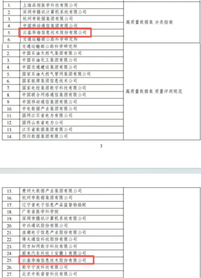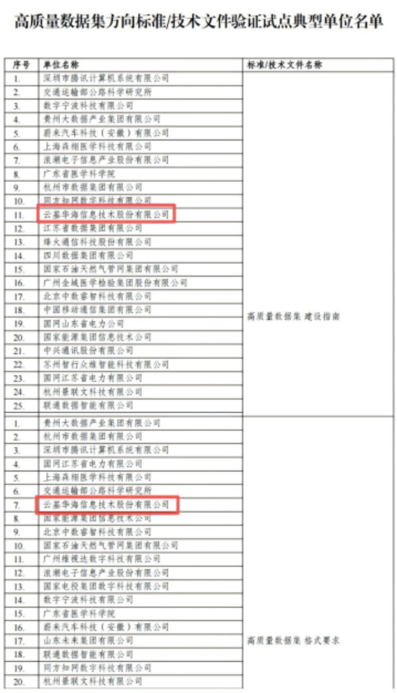 为持续提高标准技术指标的先进性、科学性和适用性,在国家数据局指导下,全国数据标准化技术委员会(以下简称“全国数标委”)秘书处组织开展了数据基础设施、高质量数据集、数据匿名化等6个重点方向15个标准和2个技术文件的验证试点工作,经形式审查、标准验证、报告评审等过程,形成数据领域重点标准验证试点典型单位。云基华海信息技术股份有限公司(简称“云基华海”)凭借在数据要素领域的深厚技术积累与实践成果,成功入选数据基础设施方向、高质量数据集及数据匿名化方向标准/技术文件验证试点典型单位。